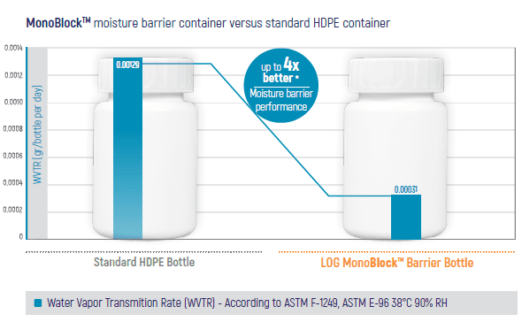 Tests haben gezeigt, dass MonoBlock® eine bis zu 4-mal bessere Feuchtigkeitsbarriereleistung im Vergleich zu Standard-HDPE-Behältern bietet.